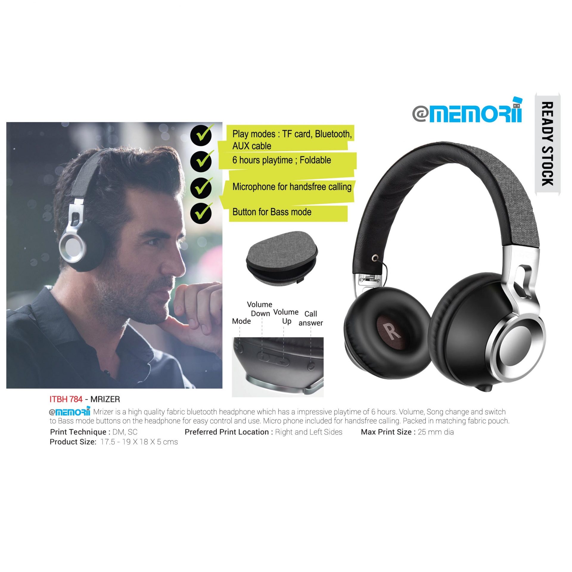 A high quality fabric bluetooth headphone which has a impressive playtime of 6 hours. Volume, Song change and switch to Bass mode buttons on the headphone for easy control and use. Micro phone included for handsfree calling. Packed in a pouch.