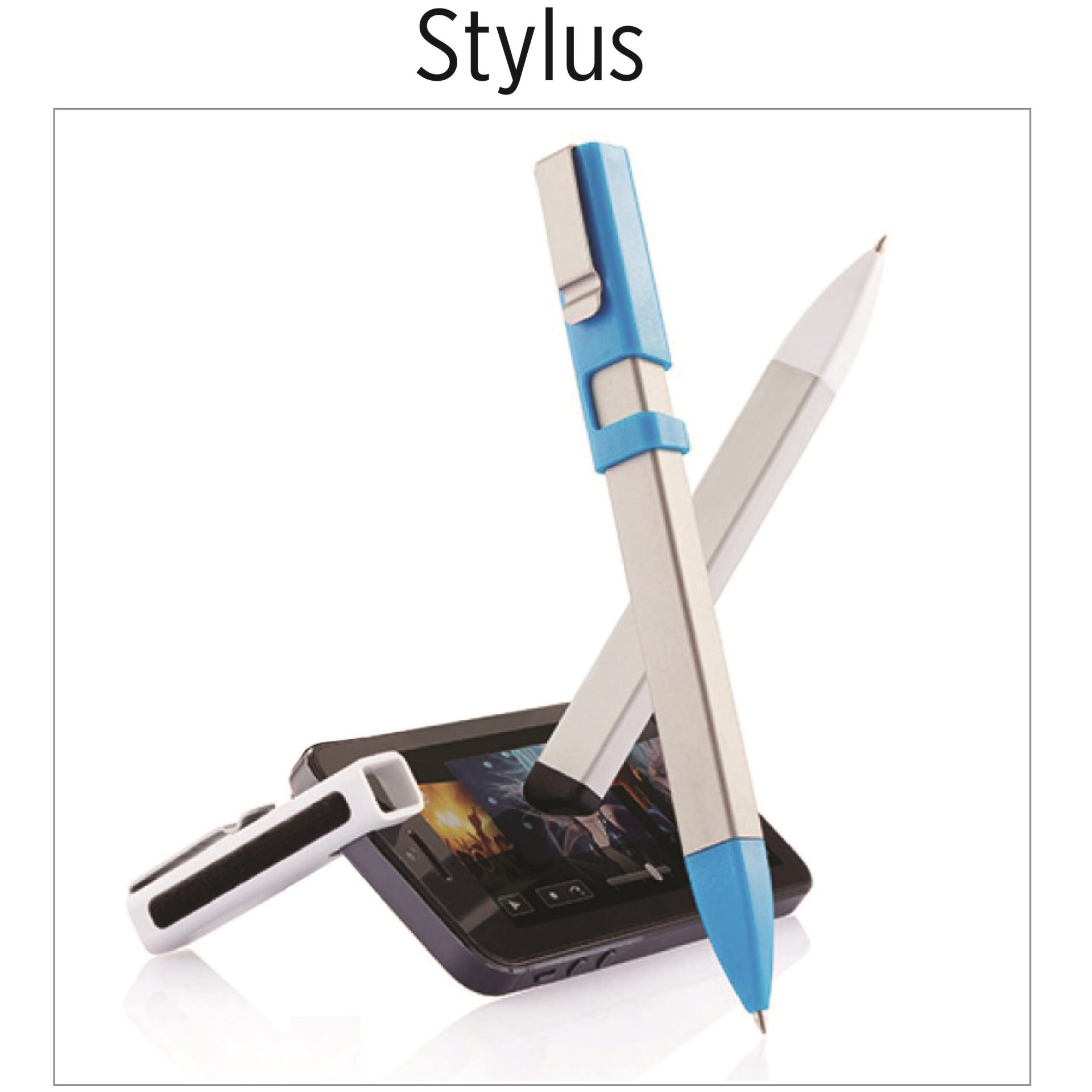 Combines all your daily mobile needs in one stylus pen. The clip is designed to hold your mobile phone and clean your screen. The pen comes with a blue and black re?ll. Registered design?