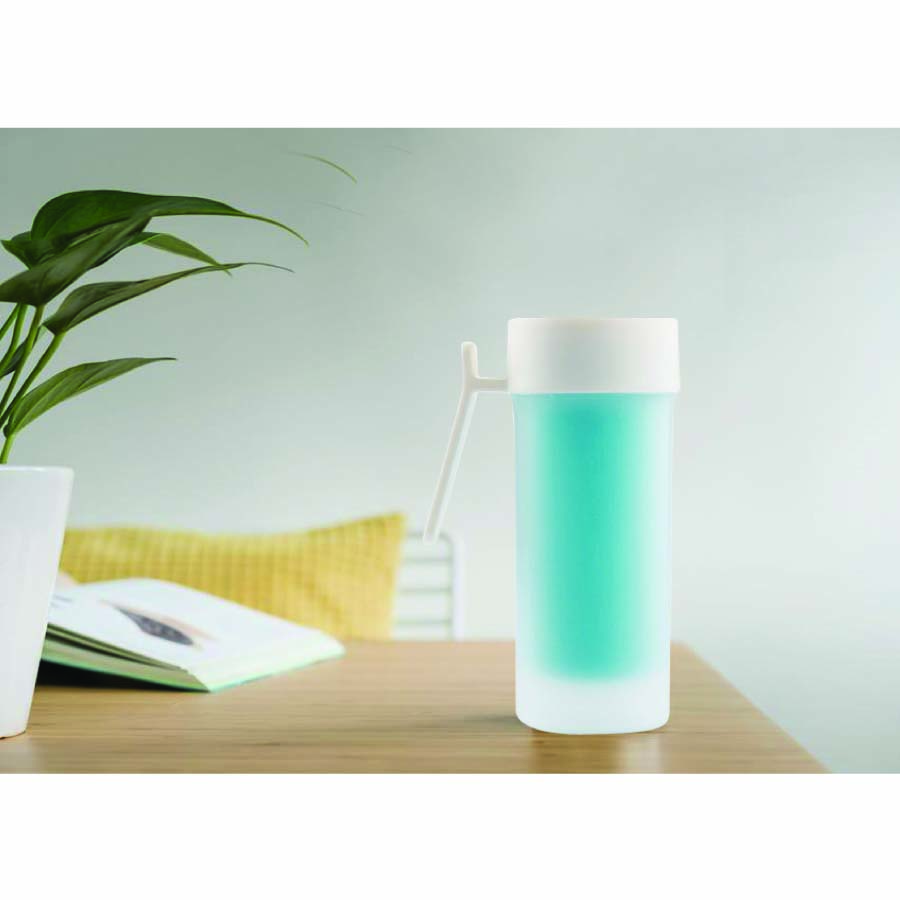 A fresh looking double wall plastic mug with frosted outside and sliding lid. 275ml content. Registered design?