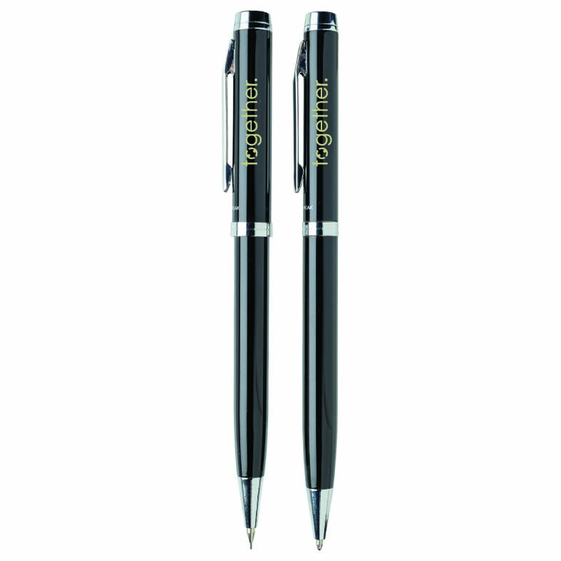 Pen set with ballpen and pencil is known by its quality and elegance. Comes with 1200m writing re?ll with German ink and pencil with 3 leads of 0.7 mm. Packed in Swiss Peak giftbox. Sturdy Steel Exterior